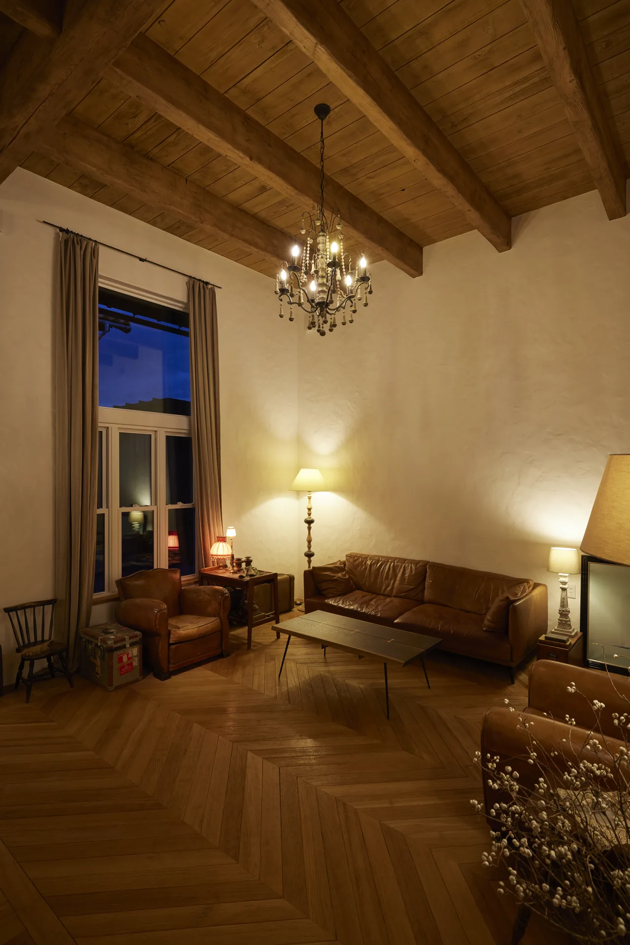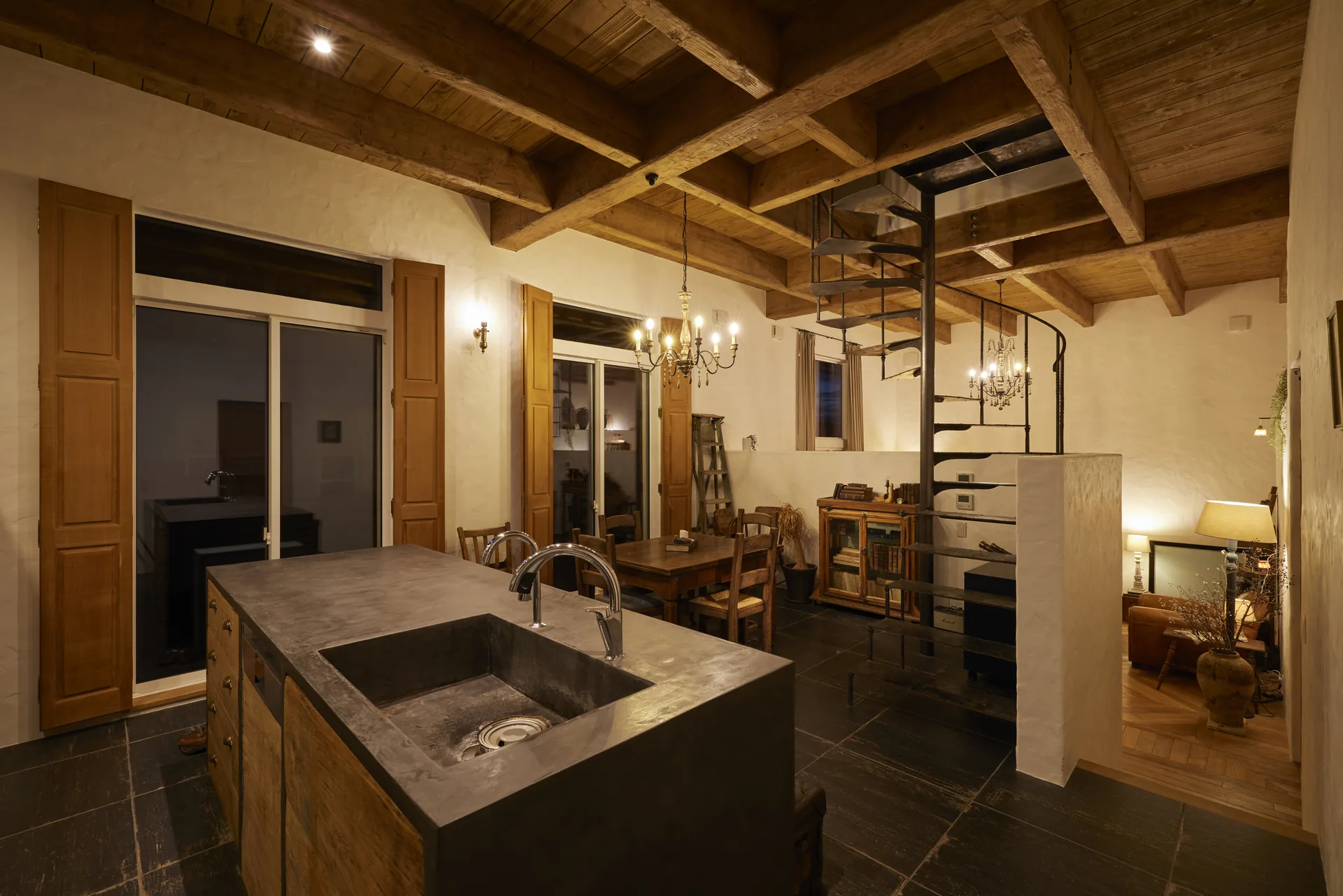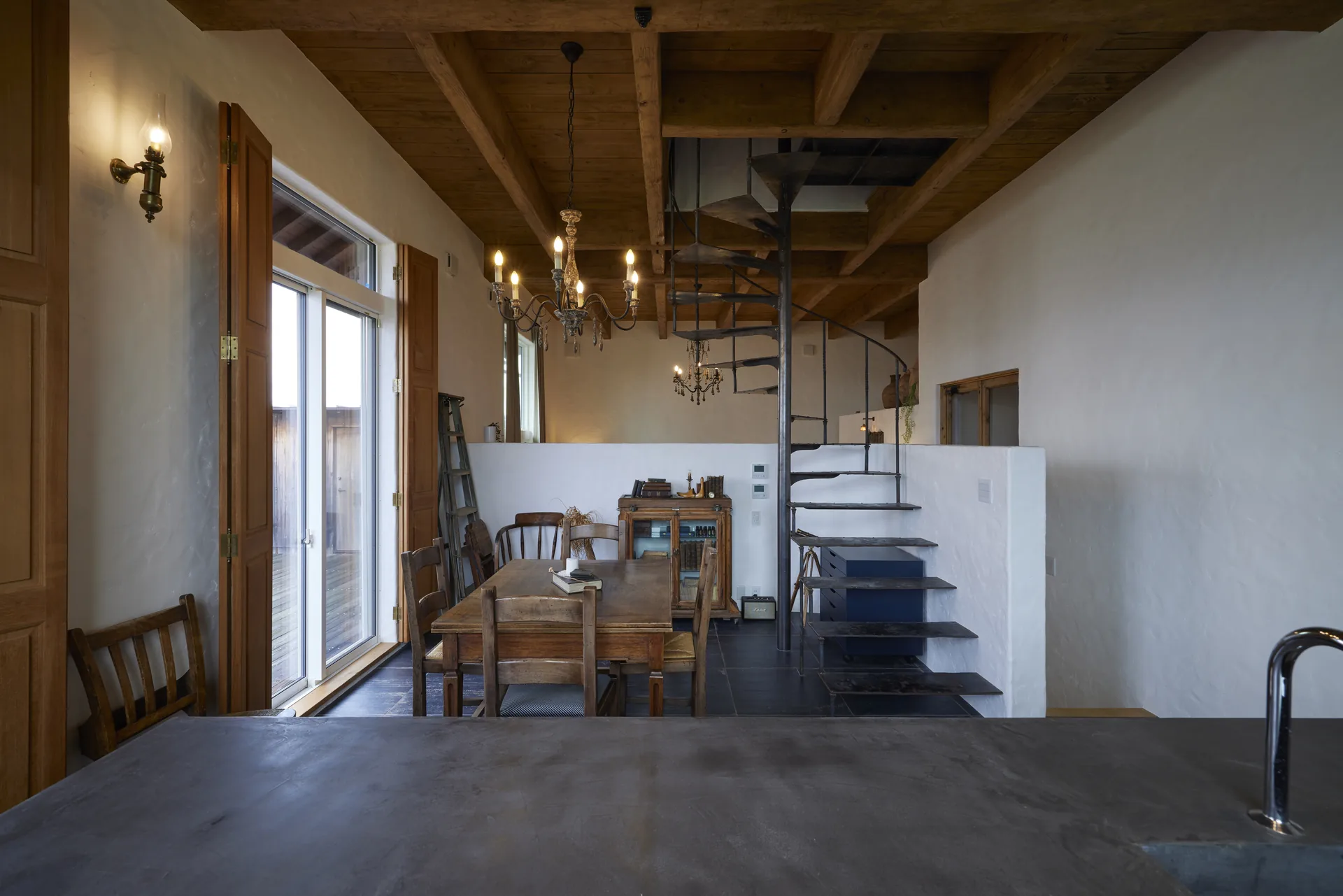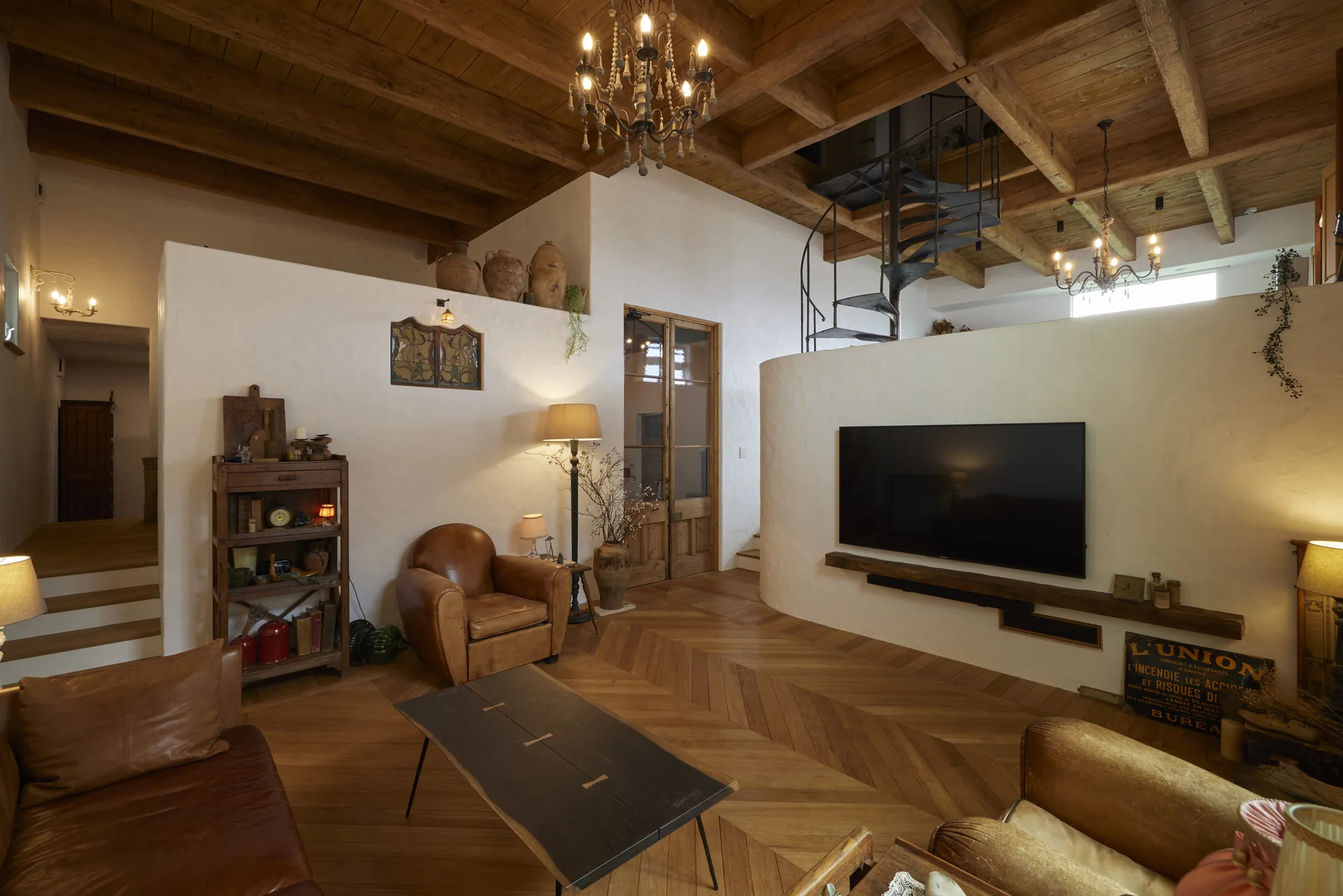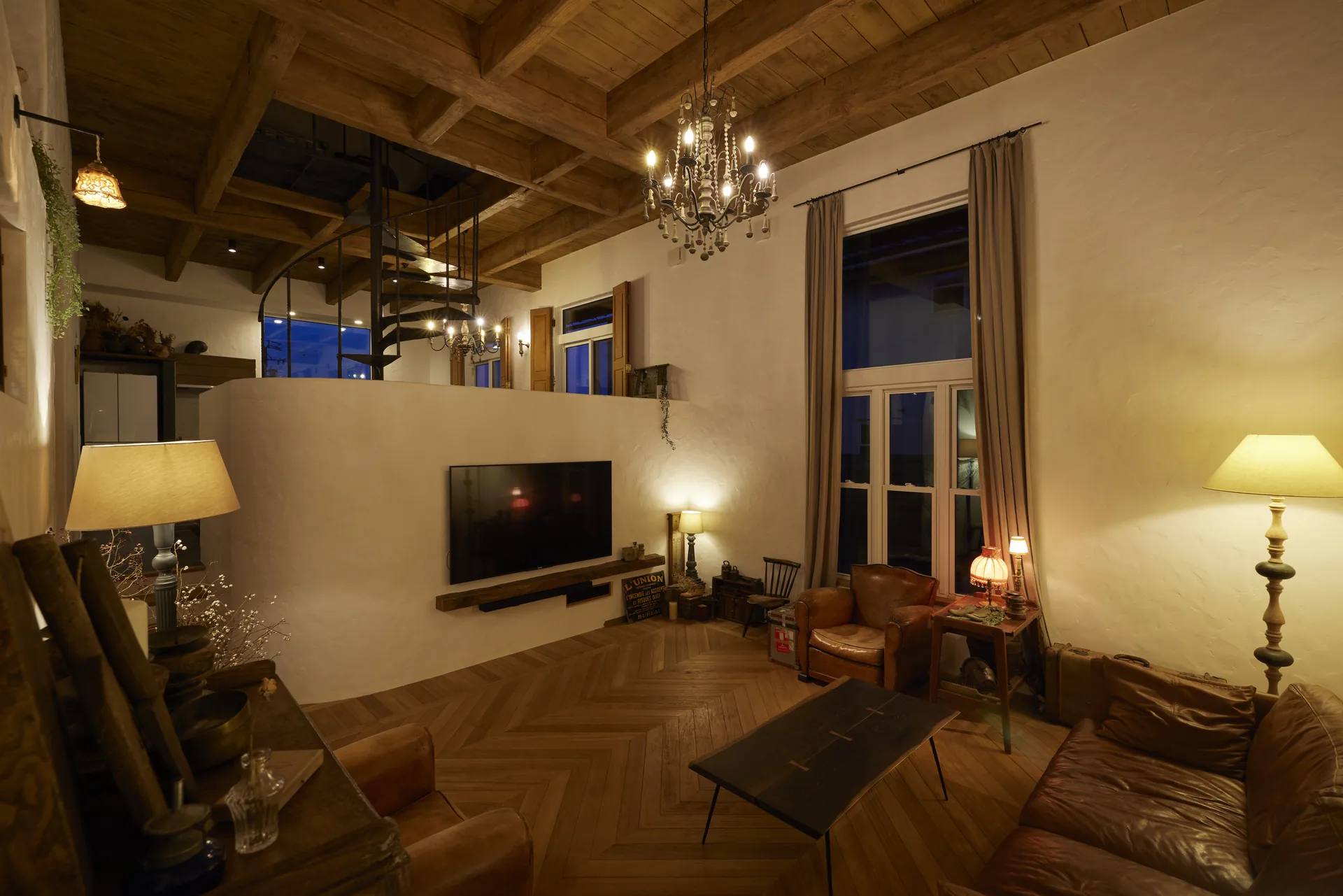 ヘリンボーン張りの無垢フローリング、螺旋階段、木組みの天井。ここに立つと、時間の流れがゆっくりになるような、そんな感覚があります。