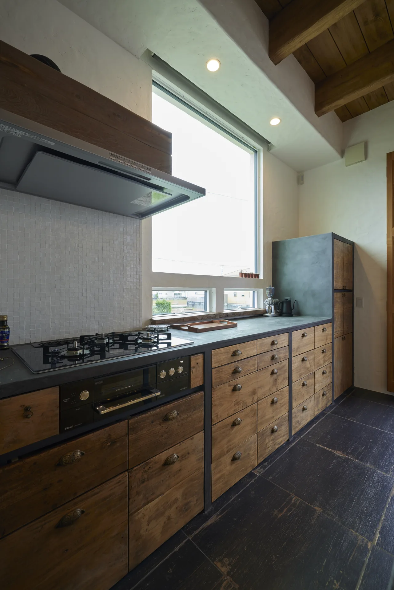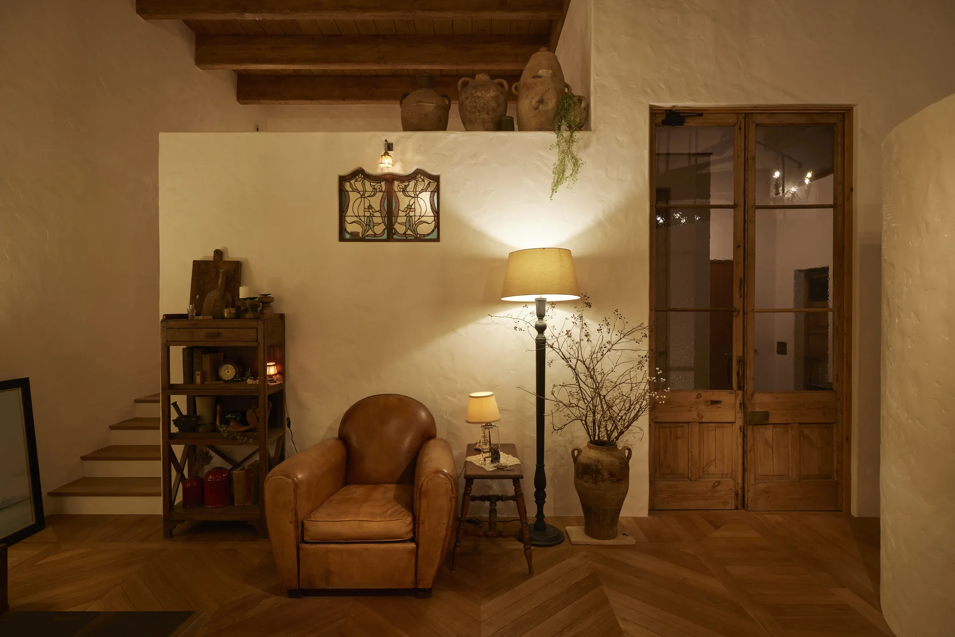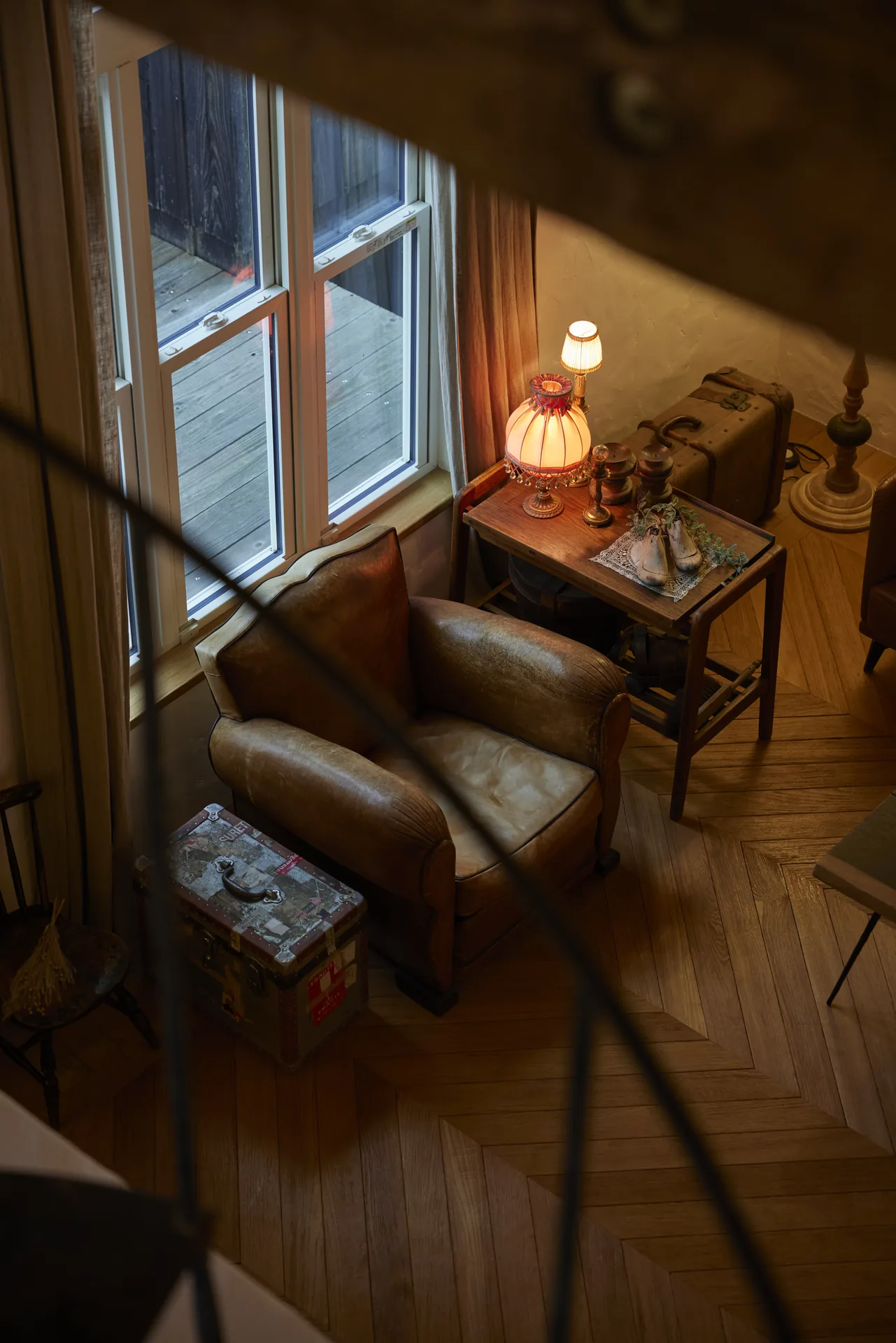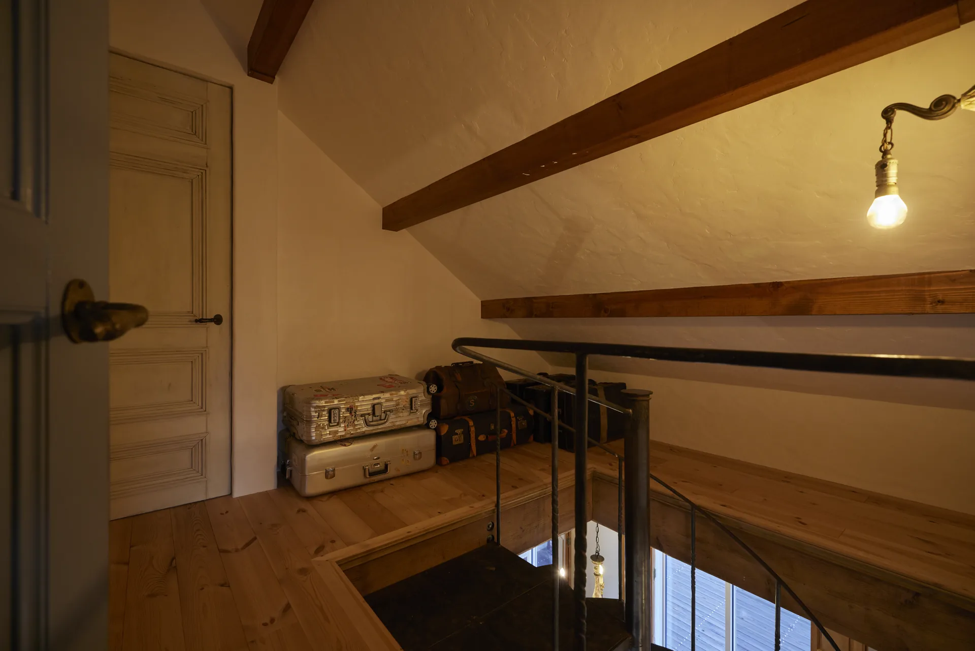 ヘリンボーン張りの無垢フローリング、螺旋階段、木組みの天井。ここに立つと、時間の流れがゆっくりになるような、そんな感覚があります。