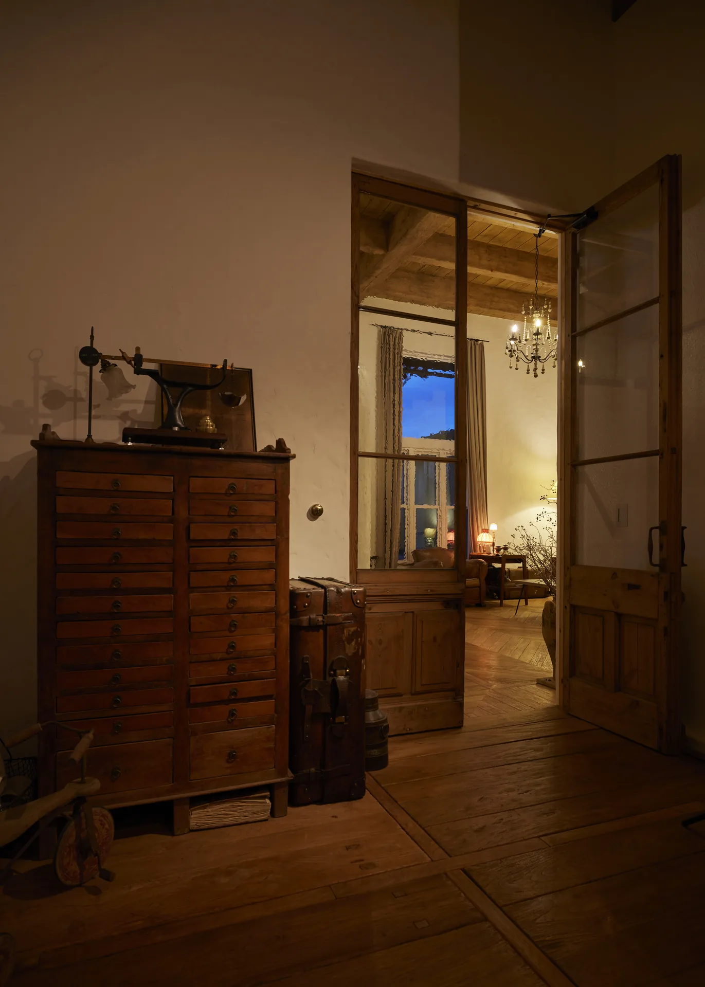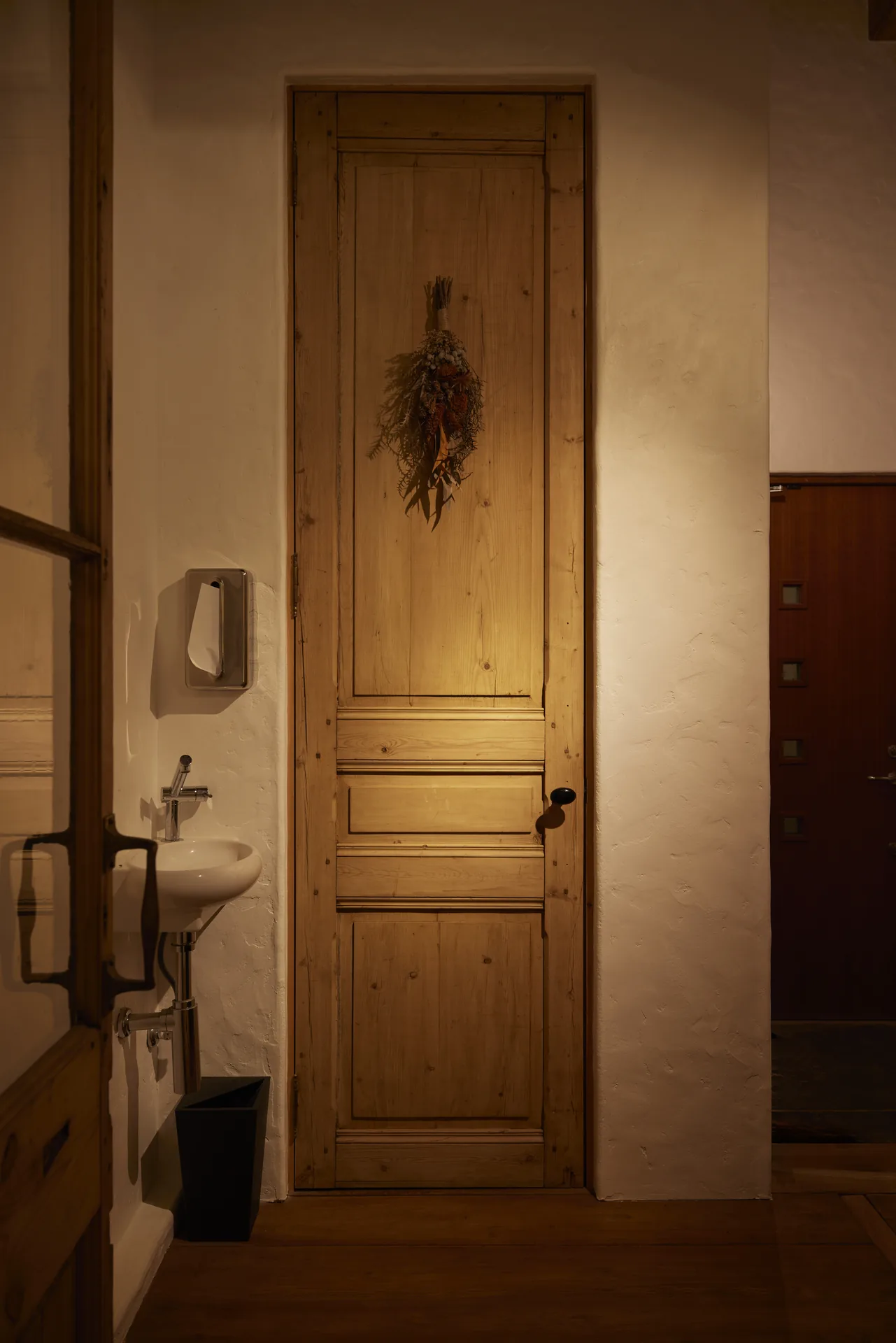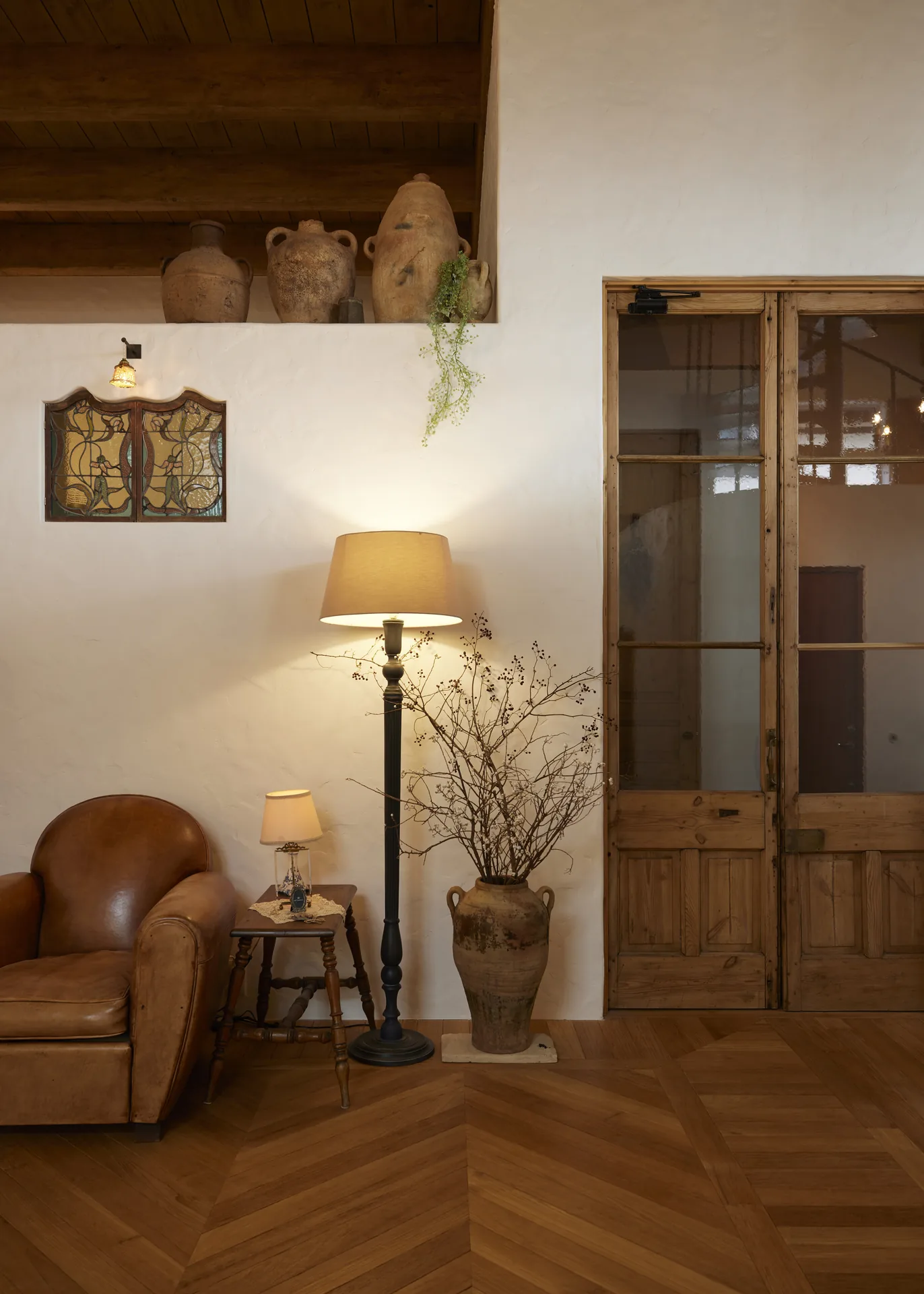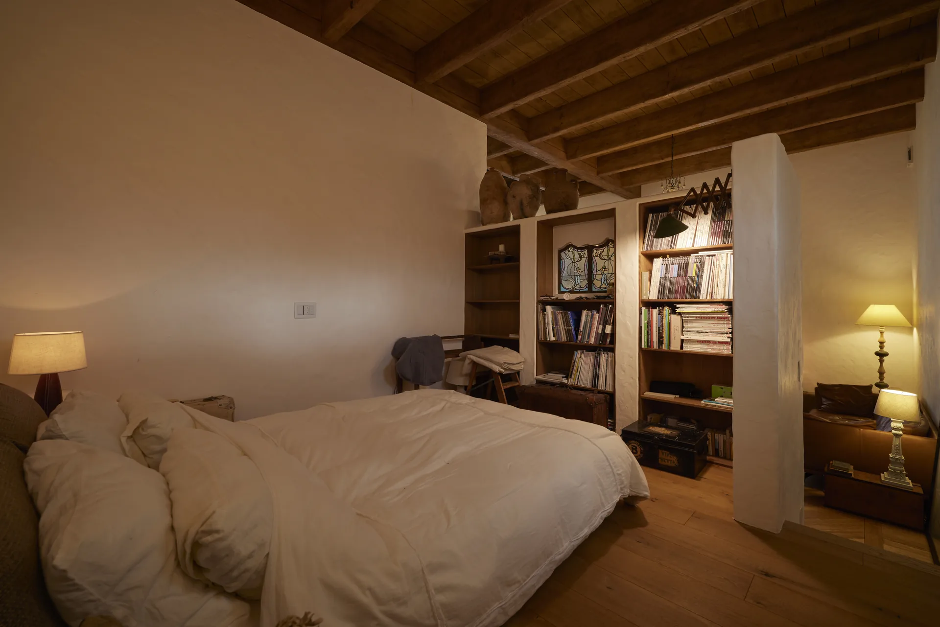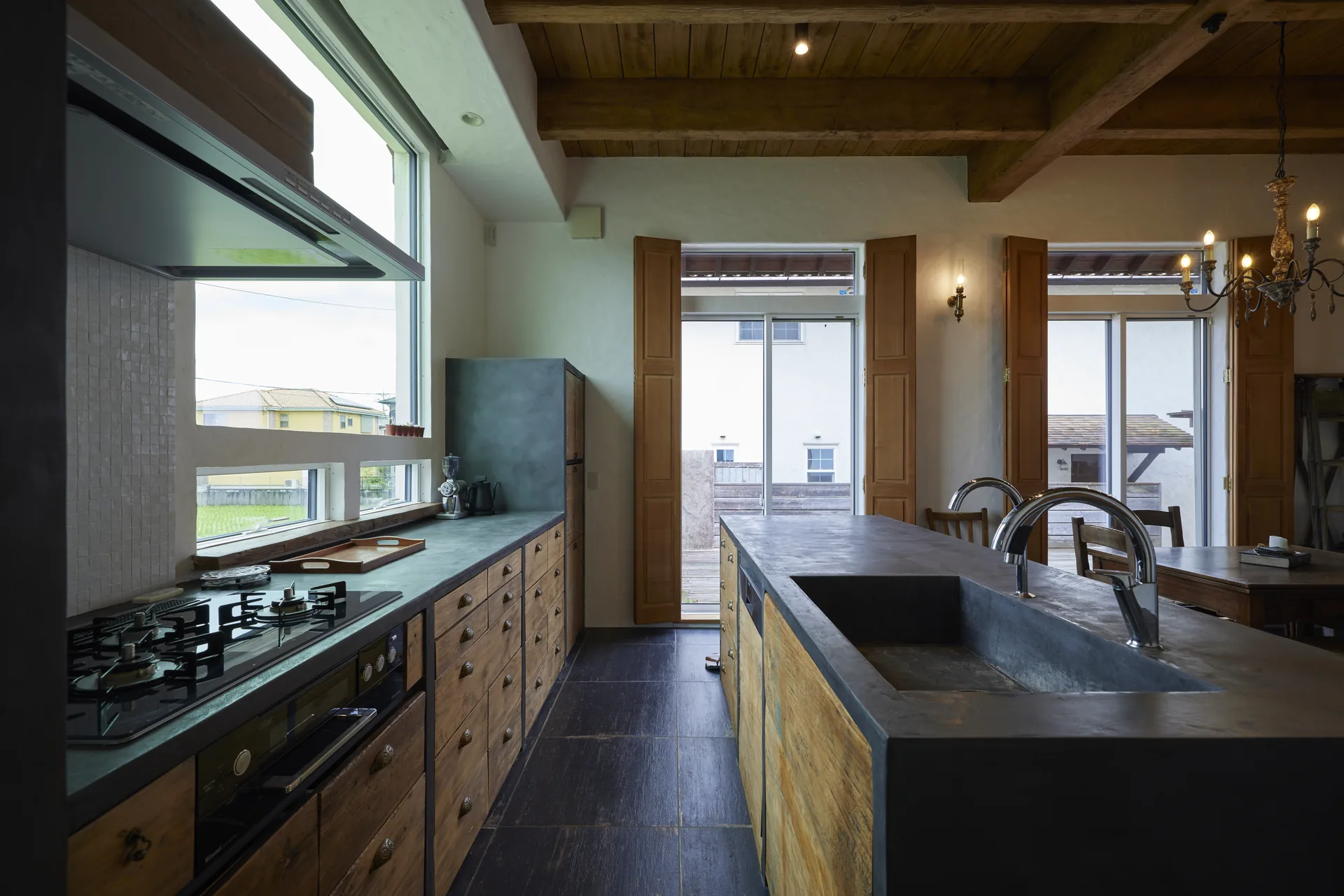 ヘリンボーン張りの無垢フローリング、螺旋階段、木組みの天井。ここに立つと、時間の流れがゆっくりになるような、そんな感覚があります。